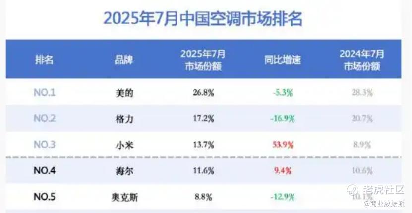 据奥维云网及GfK中怡康数据,2025年7月中国空调市场销量排名:美的线上份额约26.8%领跑,格力约17.2%,小米13.7%且同比增速53.9%——前五里唯一的“高速增长”变量,海尔11.6%,奥克斯8.8%。