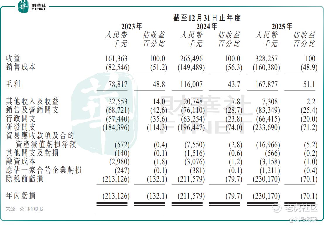 业绩表现方面,2023年至2025年,公司收入由1.61亿元增长至3.28亿元,同期亏损分别为2.13亿元、2.12亿元及2.30亿元。公司以高研发投入驱动发展,2025年研发支出超过2.3亿元,占收入比重高达71.2%,这也是公司持续亏损的主要原因之一。
