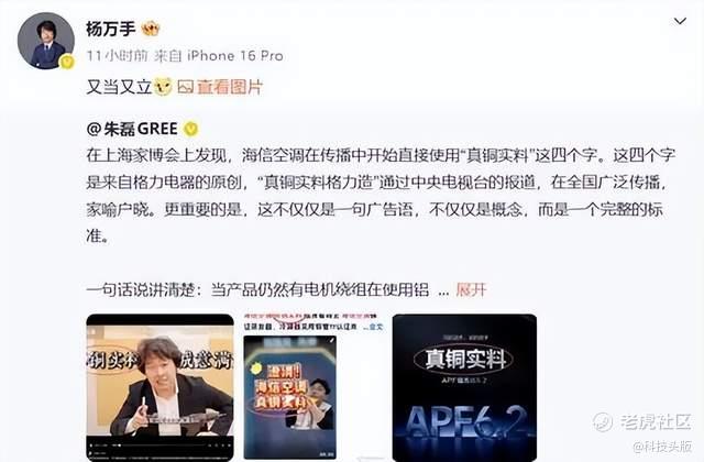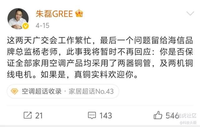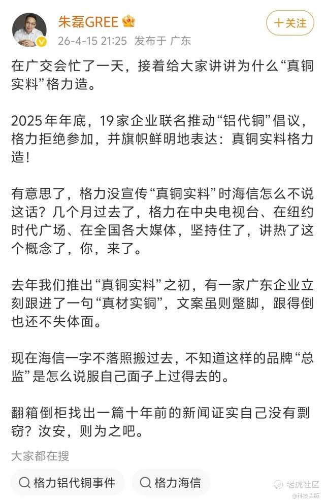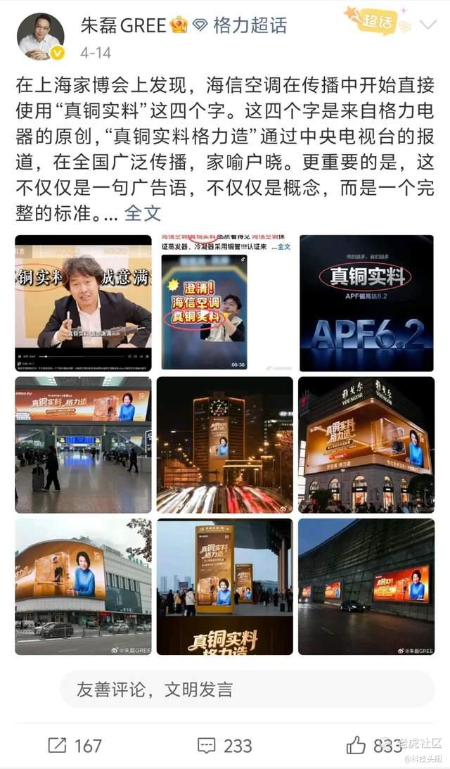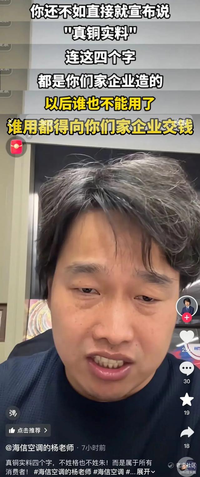 海信空气事业部品牌总监杨祥玺在第一时间回应,称“‘真铜实料’这四个字,不姓格也不姓朱,而是属于所有消费者”。