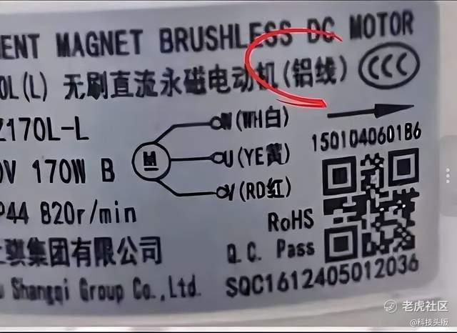 视频显示,一款格力5匹空调的风机电机铭牌上明确标注有“(铝线)”字样。