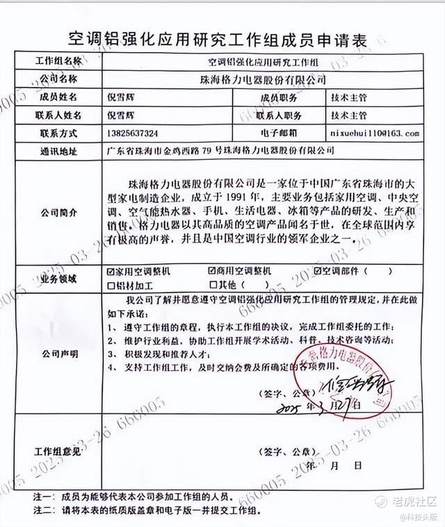 当晚,海信高管迅速以“又当又立”四字回击,并附上格力曾申请加入“空调铝强化应用研究工作组”的表格扫描件。
