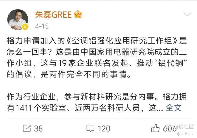 朱磊在4月15日晚连发五条长文回应称,参与新材料研究属于企业正常技术预研行为,格力拥有1411个实验室、近两万名科研人员,有能力对“铝替代铜”的可行性进行长期系统的研究。