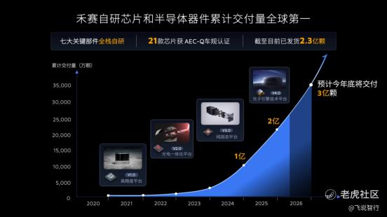 跨越五代芯片平台研发与量产,禾赛目前是唯一行业做到包括激光器、探测器、激光驱动器、TIA 芯片、ADC 芯片、数字信号处理器和控制器七大关键部件全栈自研的激光雷达公司。截止目前,禾赛已有 21 款自研芯片获得 AEC-Q 车规认证,已累计交付达 2.3 亿颗,预计到 2026 年底,累计出货量将超 3 亿颗,自研芯片和半导体器件累计交付量居行业内全球第一 。