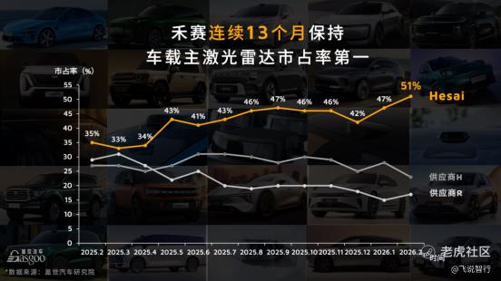 禾赛科技持续领跑中国车载激光雷达市场。据盖世汽车研究院数据,2025 年禾赛以超 40%市场份额位居行业第一,2026 年延续高速增长态势,2 月份额进一步提升至 51%,装机量达行业第二名的 2.2 倍、第三名 3 倍以上,连续 13 个月保持市场领先地位。公司产品深度配套理想、小米、比亚迪、极氪等头部车企热销车型,其中小米 YU7 及新款 SU7 全系搭载禾赛激光雷达。截至目前,禾赛已获得 40 家汽车品牌超 160 款车型量产定点,覆盖中国销量前十的全部汽车品牌。