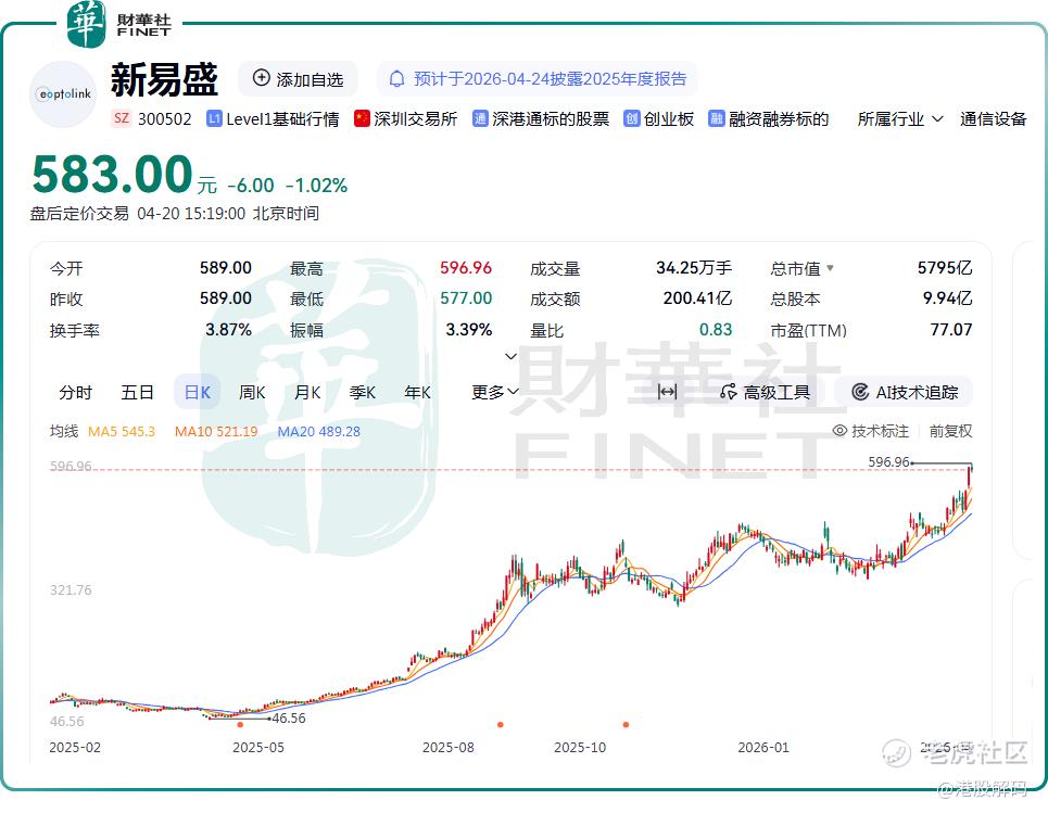 从资本市场表现来看,新易盛(300502.SZ)走出了强势行情。该股自2025年4月初触及46.56元/股阶段低点启动,到如今最高触及596.96元/股的历史高位,仅一年多时间,新易盛股价区间累计涨幅最高达11.82倍,市值增长逾5400亿元,成为A股市场名副其实的“大牛股”,充分体现了市场对公司发展前景的高度认可与积极预期。