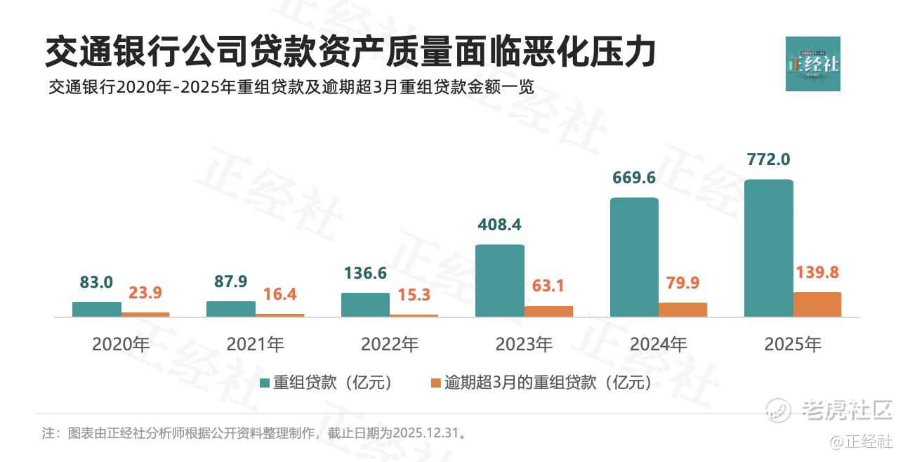 但是,正经社分析师注意到,公司类的大量不良贷款因为贷款重组而延后暴露了。2020年至2025年,重组贷款金额分别为82.99亿元、87.92亿元、 136.60亿元、408.36亿元、669.59亿元、772.01亿元,占比分别为0.14%、0.13%、0.19%、0.51%、0.78%、0.85%,2021年至2025年呈持续上升之势;逾期超过三个月的重组贷款金额分别为23.94亿元、16.25亿元、15.33亿元、63.06亿元、79.85亿元、139.78亿元。