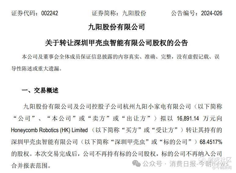 2024年年底,九阳股份为及时止损,不得不以1.7亿元完成对所持深圳甲壳虫全部股份的出售。