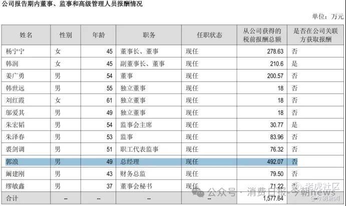 2023年,郭浪年薪高达492万元,位列高管薪酬榜单第一名。晋升为董事长的杨宁宁虽然在排名上紧随其后,但薪资只有279万元,不到郭浪的六成。