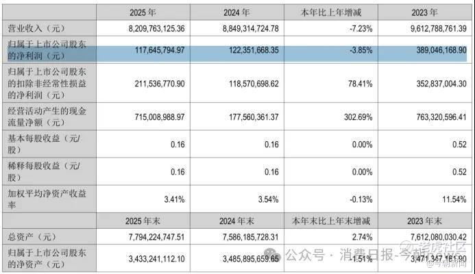 2020年至2025年,该公司归母净利润分别为9.4亿元、7.46亿元、5.3亿元、3.89亿元、1.22亿元、1.18亿元。五年间净利润缩水近九成,2025年的1.18亿元已是上市以来的最低水平。