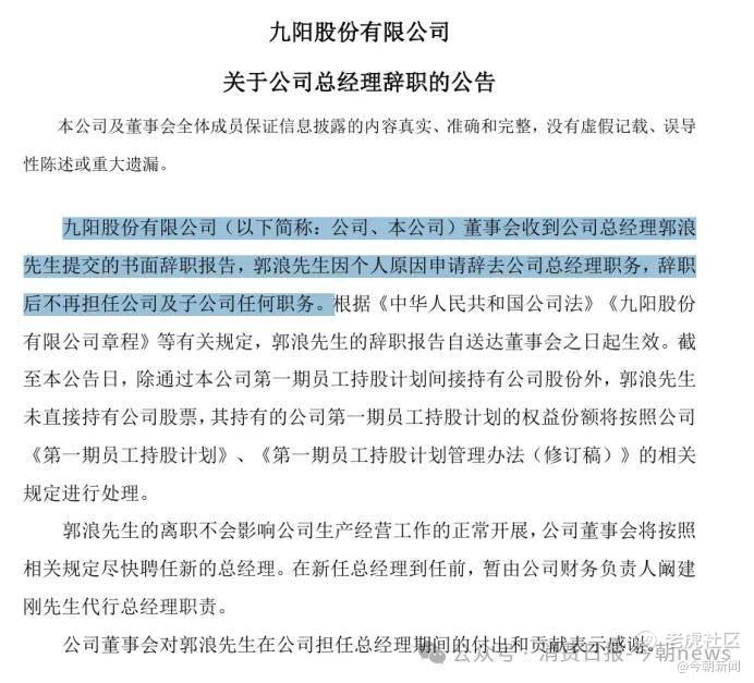 三年时间后,九阳股份外调职业经理人,于2022年年底引入外部人员郭浪接替杨宁宁。