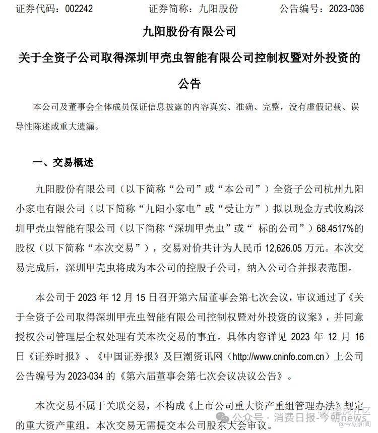 在郭浪的带领下,2023年12月,九阳股份宣布以1.3亿元收购主业为扫地机器人的深圳甲壳虫智能有限公司68.5%的股权。