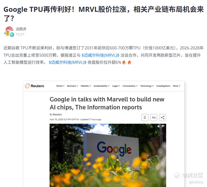 今天看到话题虎老师特意开讨论帖,说近期谷歌 TPU不断迎来利好,不光他自己涨,还把相关的股票,带着一起涨,见者有份的那样。只是因为有报道是正与 $迈威尔科技(MRVL)$ 洽谈合作,共同开发两款新型芯片。这个消息就刺激到 $迈威尔科技(MRVL)$ 夜盘股价拉升超6%。[惊讶]