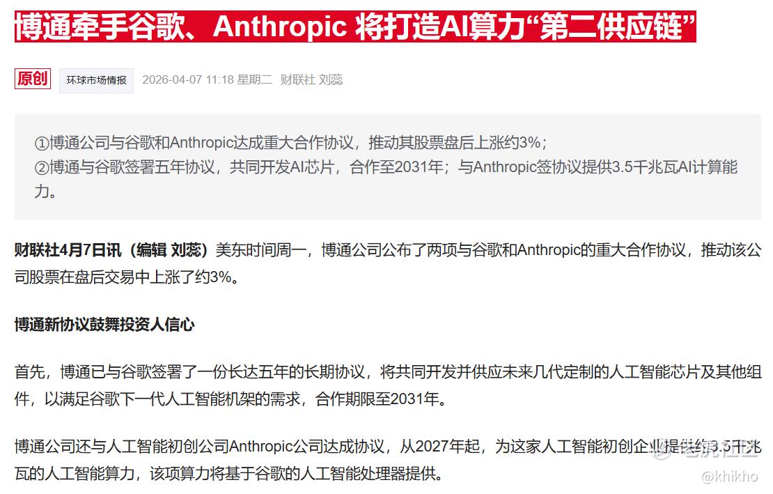 2026年4月6日,Broadcom在提交美国证券交易委员会(SEC)的8-K文件中披露了一项震撼行业的三方协议:AI巨头Anthropic将与谷歌和Broadcom达成长期合作,确保到2031年的TPU供应,预计从2027年起将获得约3.5吉瓦(GW)的庞大算力支持 。这不仅是Anthropic历史上最大的算力承诺,也是AI基础设施领域最具分量的芯片采购决策之一。