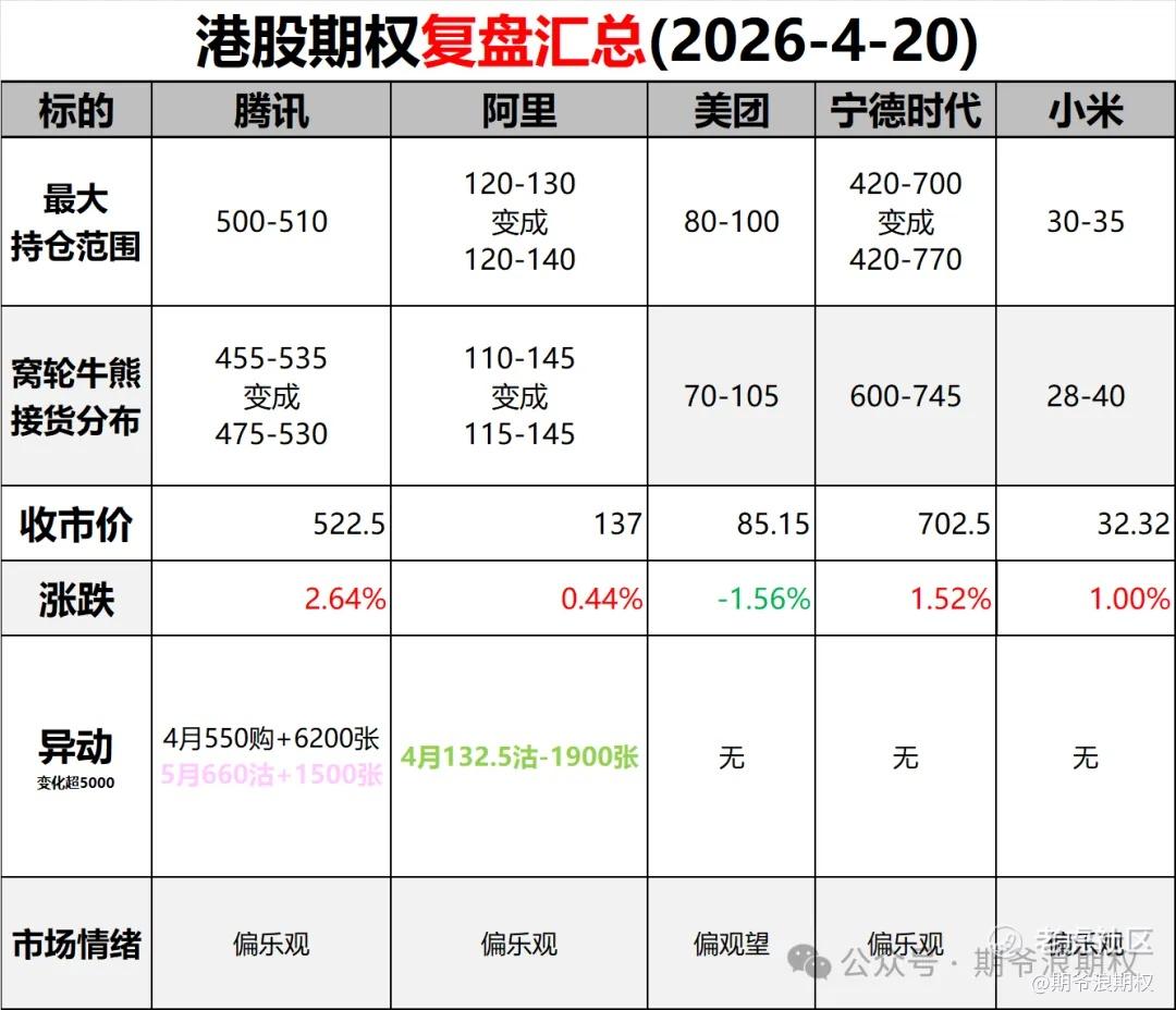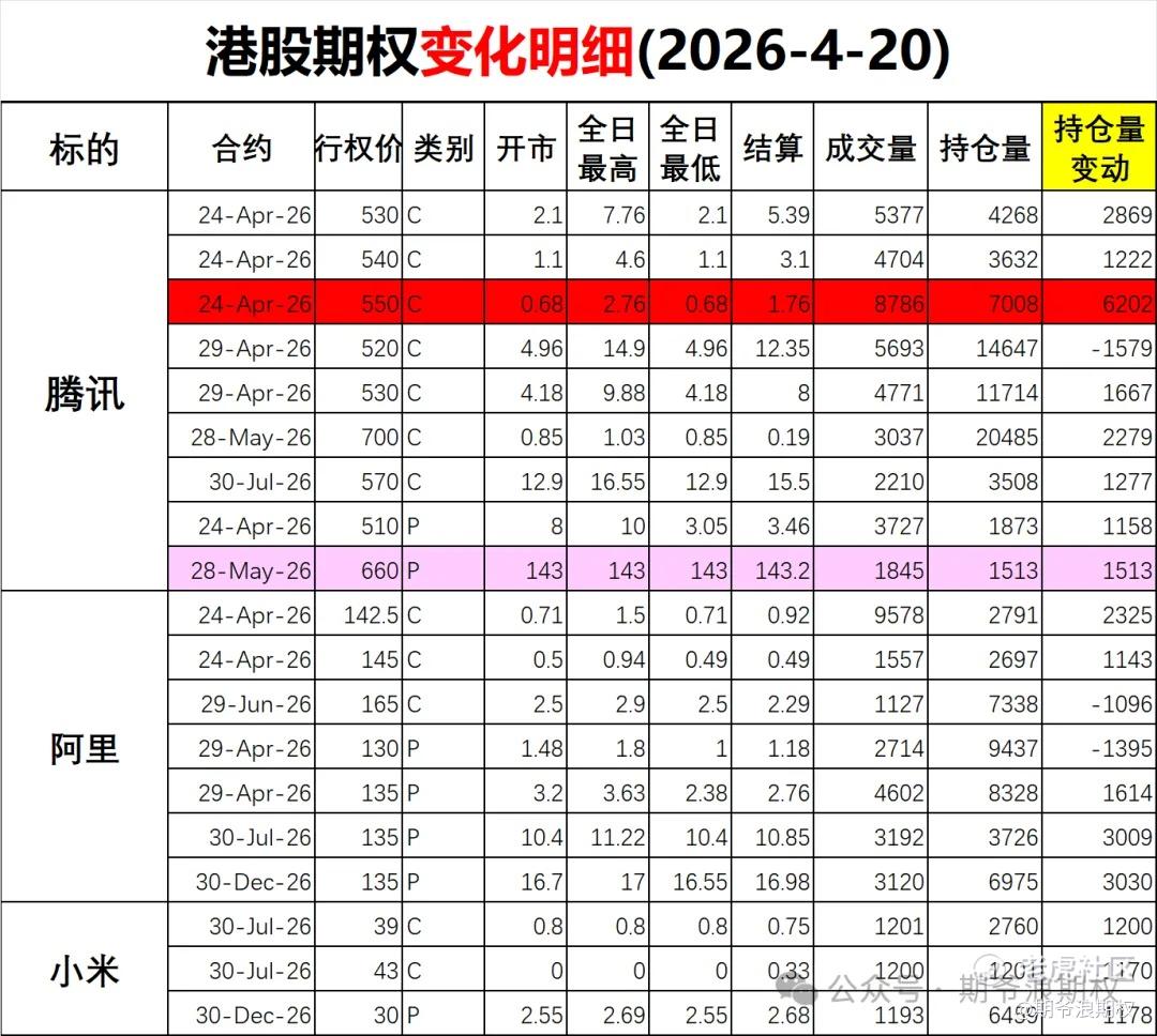 不管行情怎么样,期权复盘找方向。下面是A股和港股的期权复盘汇总和变化明细,期权变化明细要注意的是: 红色表示增仓较大 绿色表示增仓较小 粉色表示深度实值增仓(看多) 浅绿色表示深度实值减仓(看空)