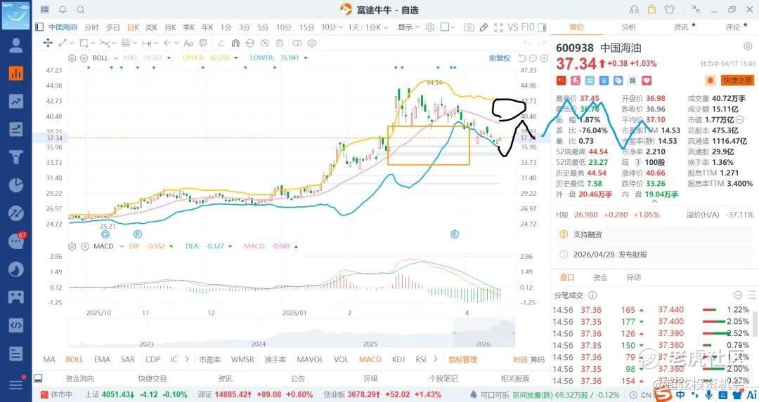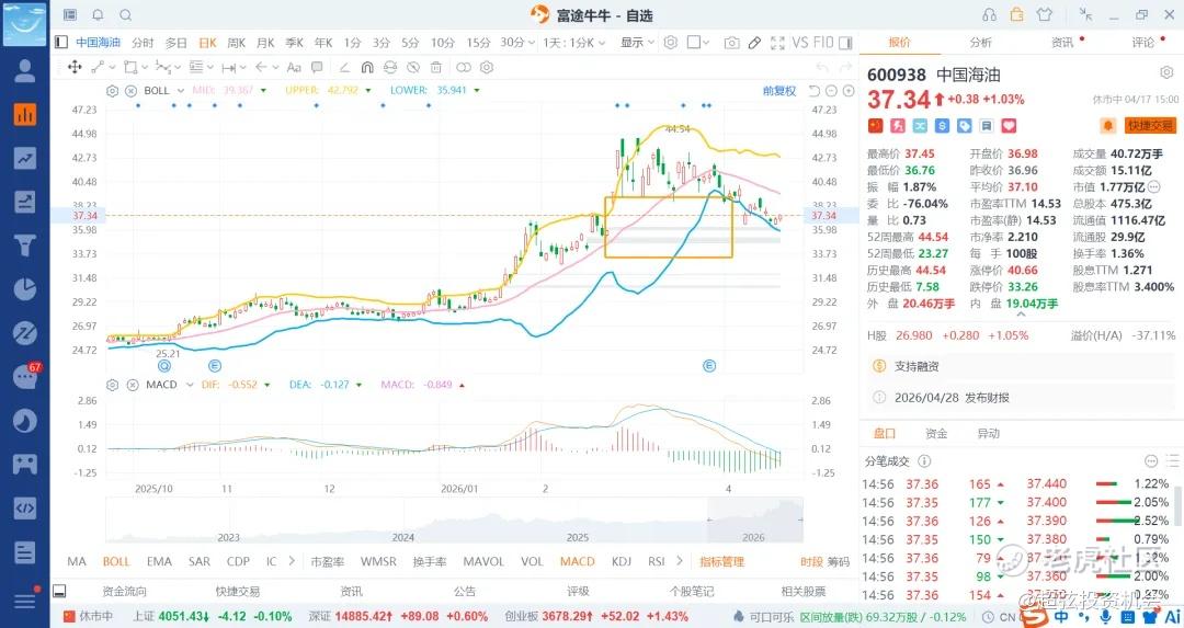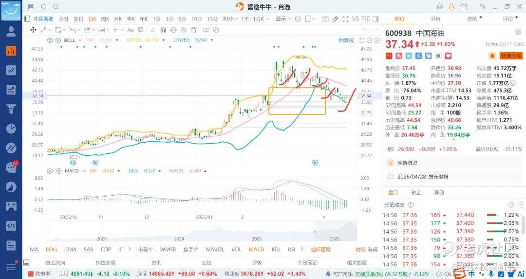 后续低开很多就先看37.5附近,后续看39/42区域附近就差不多了,未来会比较长的时间在36+-3+3区域运动,也就是33-36-39-42区域了,一时半会是破不了45了,那么就靠震荡的差价来获利就行了,除非伊美继续干,那么原油飙升到150-200美金这种特殊的情况除外了,这种干起来,那么海油就是五六十价格打底了,那么就做到了跌有基本面的支持,叠加部分的技术面做t差价,要是意外就是大肉的存在了,控制好头寸就是立于不败之地,加上现在地缘政治处于多事之秋,一旦有风吹草动,那么就是能源和商品的天下了。