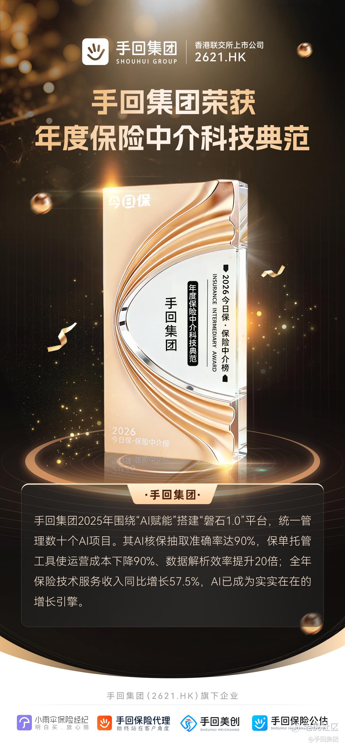 手回集团凭借在保险科技领域的持续创新与AI技术深度应用,荣获今日保·保险中介榜“年度保险中介科技典范”奖项。该奖项旨在表彰推动行业转型发展的杰出贡献者,标志着手回集团以科技赋能保险中介高质量发展的实践获得行业高度认可。