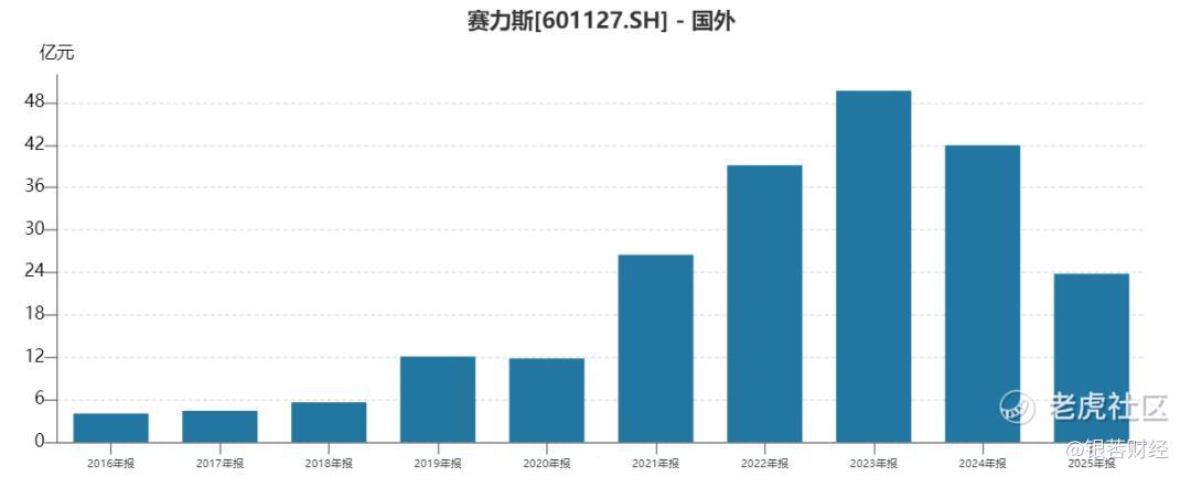最后一个隐忧来自海外业务。财报显示,2023年、2024年,赛力斯海外营收均超过40亿元,到了2025年,海外营收同比大幅下滑43.32%,只有23.79亿元。