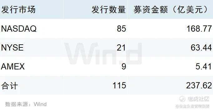 纳斯达克:85 家,募资 168.77 亿美元,占比71.02%