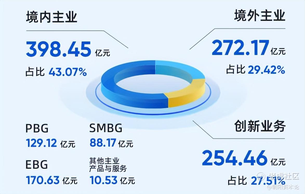 拆开看,国内主业(PBG+EBG+SMBG)合计约387.92亿元,占公司整体收入的41.94%;境外主业272.17亿元,占29.42%;创新业务254.46亿元,占27.51%。