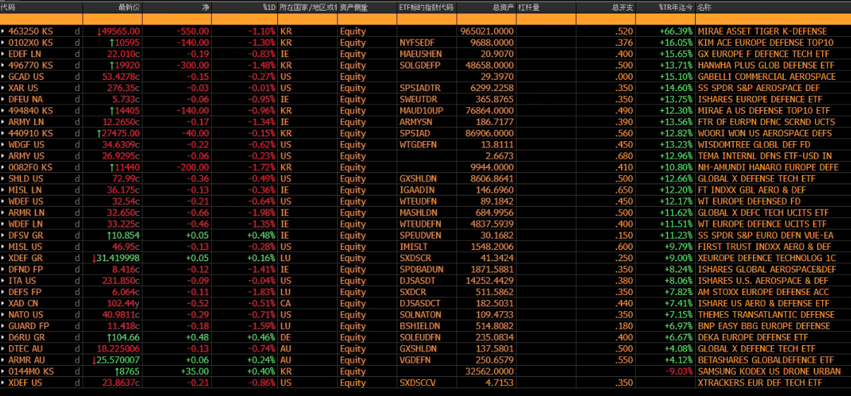 今年军工ETF涨幅不错,韩国最大的军工ETF年内暴涨66%,英国最大的军工ETF今年涨超11%,明显跑赢富时100指数6.8%的涨幅,美股最大的军工ETF $iShares Dow Jones U.S. Aerospace(ITA)$ 今年上涨8%,跑赢 $纳斯达克(.IXIC)$ :