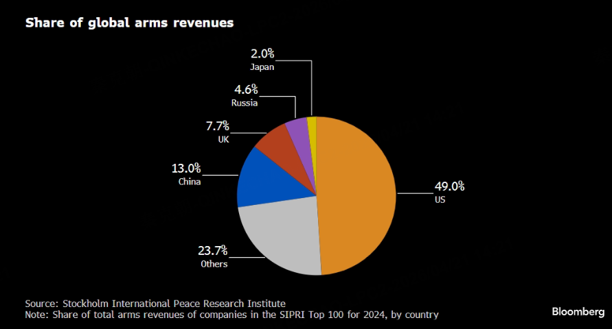 从全球来看,美国是最大的军火供应商,市场份额近半,日本仅占2%: