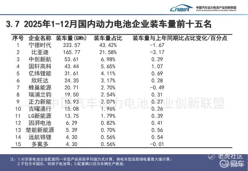 2025年,宁德时代国内市占率43.42%,较上一年下滑1.67个百分点。中创新航装车量53.61GWh,市占率接近7%;国轩高科43.44GWh,市占率5.65%;欣旺达24.35GWh,位居行业第六。