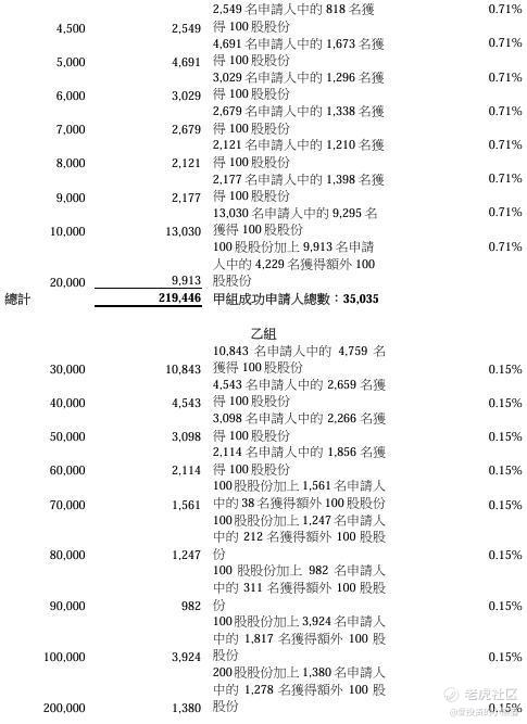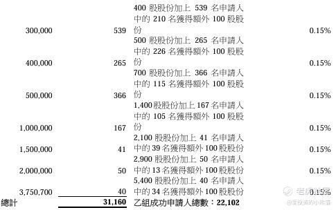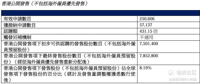 配售情况:250606人认购,这次公配431.15倍,由于机制B分配,无回拨比率,国配有18.50倍,一手中签率0.71%,认购200手稳中1手,同时乙组31160人申购,其中顶头槌申购40张,获配率0.15%。