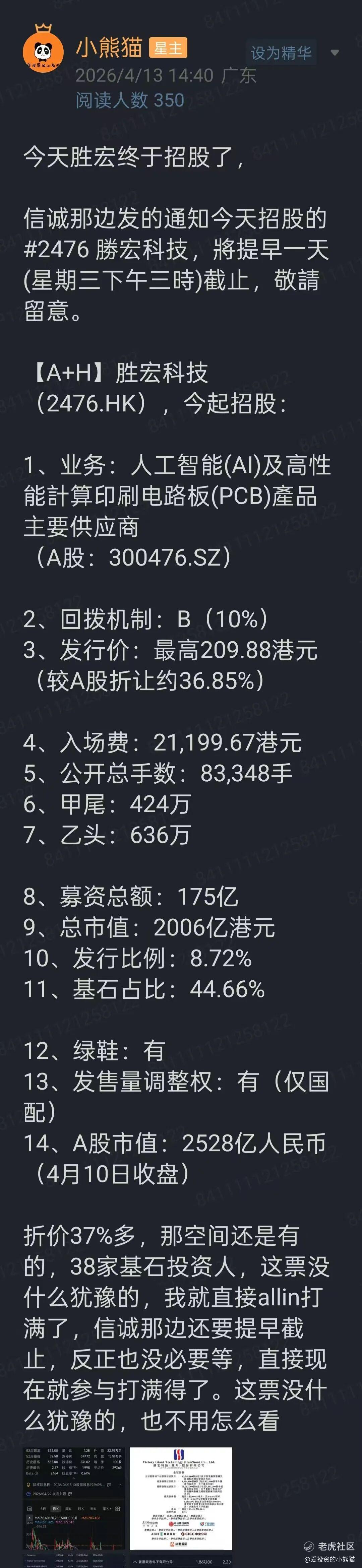 之前在xq里就提示:折价37%多,那空间还是有的,38家基石投资人,这票没什么犹豫的,我就直接allin打满了,xc那边还要提早截止,反正也没必要等,直接现在就参与打满得了。这票没什么犹豫的,也不用怎么看。