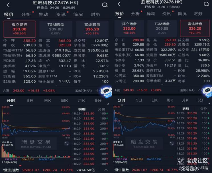胜宏科技(02476.HK)辉立暗盘以355.20港元高开,立马上冲到最高点365.00港元后回落,再震荡整理,尾盘以333.00港元报收,涨幅为58.66%,振幅19.06%,成交12.80亿港元。