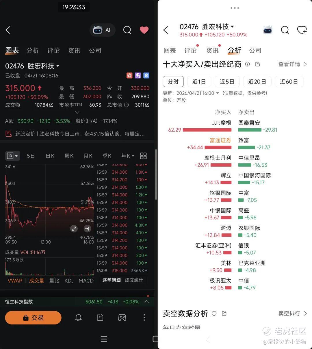 $胜宏科技(02476)$ 首日上市以330港元开盘,较209.88港元发行价高开57.23% ;盘中最高触及336.2港元,涨幅约60%,最低下探至302港元;截至收盘报315港元,较发行价上涨50.09% ,呈现高开后冲高并在高位区间震荡整理的走势。