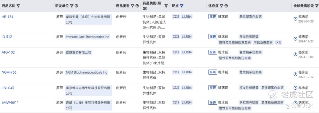 目前,全球已有针对LILRB4的单抗、CAR-T和ADC疗法进入临床,但尚无靶向LILRB4/CD3的TCE双抗进入临床阶段。迈威生物的6MW5311率先提交临床申请,有望成为该领域的首个突破者。