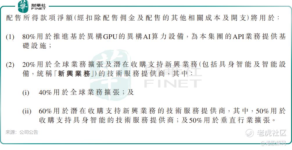 募资用途高度聚焦硬科技:80%将用于推进基于异构GPU的异构AI算力设备建设,为高速增长的API业务提供基础设施支撑;剩余20%中,40%用于全球业务扩张,60%用于潜在收购支持新兴业务的技术服务提供商(其中一半资金专门瞄准具身智能领域)。