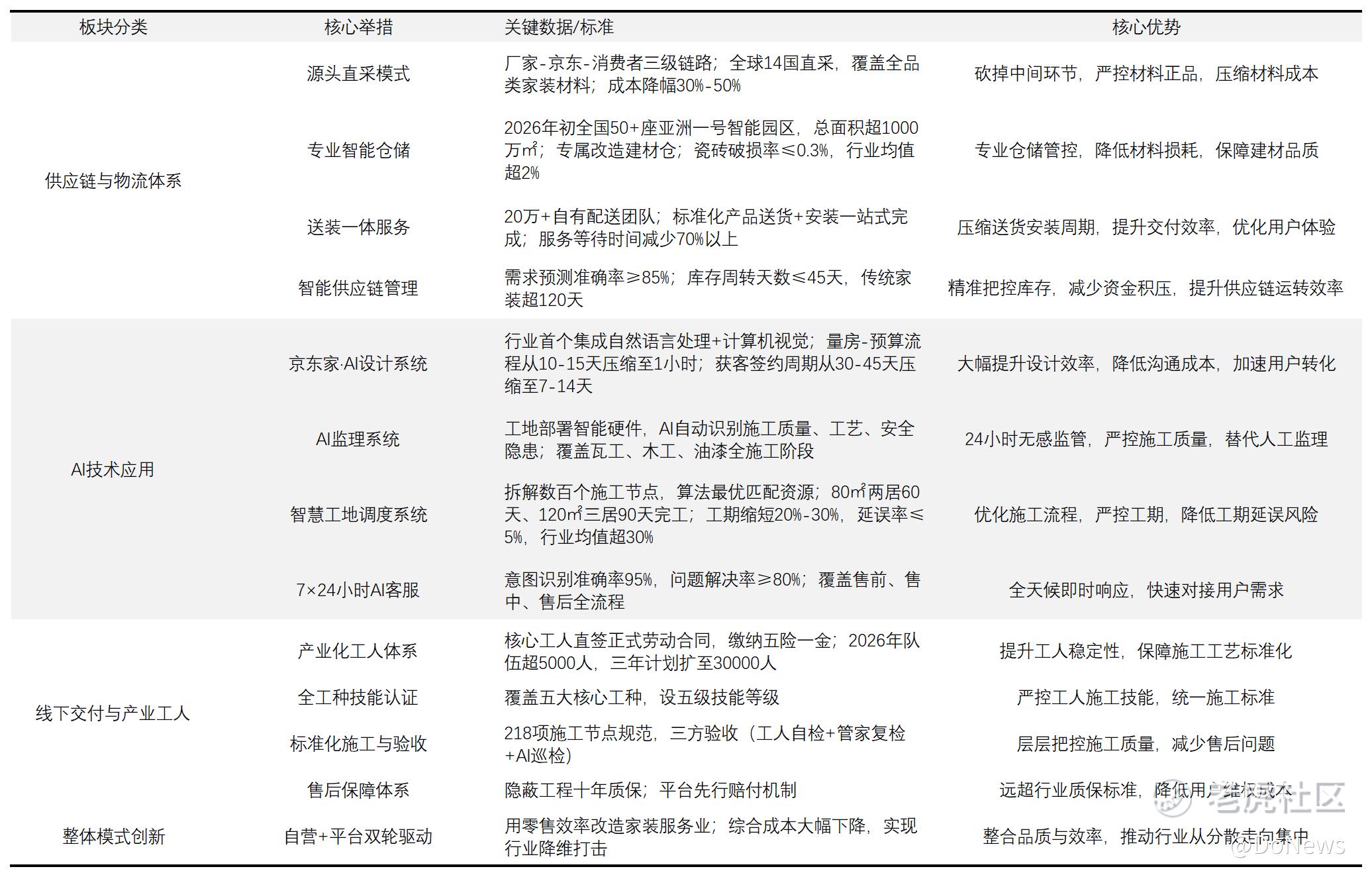 以京东为例,其依托自营与平台协同能力,一方面强化源头直采、专业仓储物流和送装一体体系,通过供应链管理提升建材品质可控性;另一方面通过AI设计、AI监理、智慧工地调度等系统,压缩从方案生成到施工管理的周期,推动服务流程更高效、更标准化。