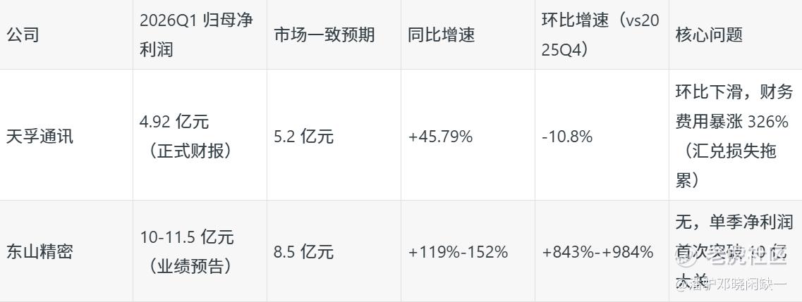 昨天早上我再次加仓东山精密,底仓一股没卖。前天天孚通讯发布2026年Q1正式财报,业绩不及市场预期,今天光模块板块集体调整,很多朋友私信问我怎么看,是不是该止盈了。正好距离我 4 月 8 日写的《3 月线下会重点拆解的东山精密,Q1 业绩兑现,我的完整估值逻辑》过去了两周,股价也从当时的 120 元左右涨到今天收盘的 186.34 元,市值正式突破 3400 亿。
