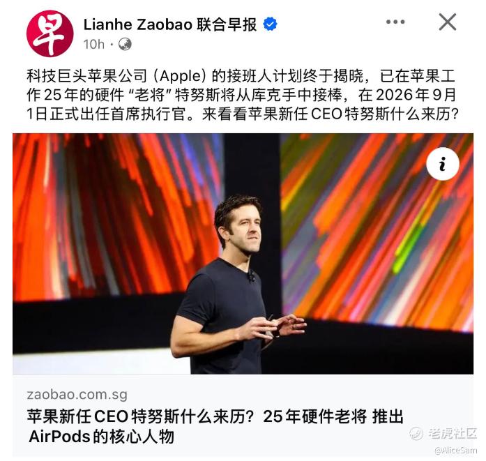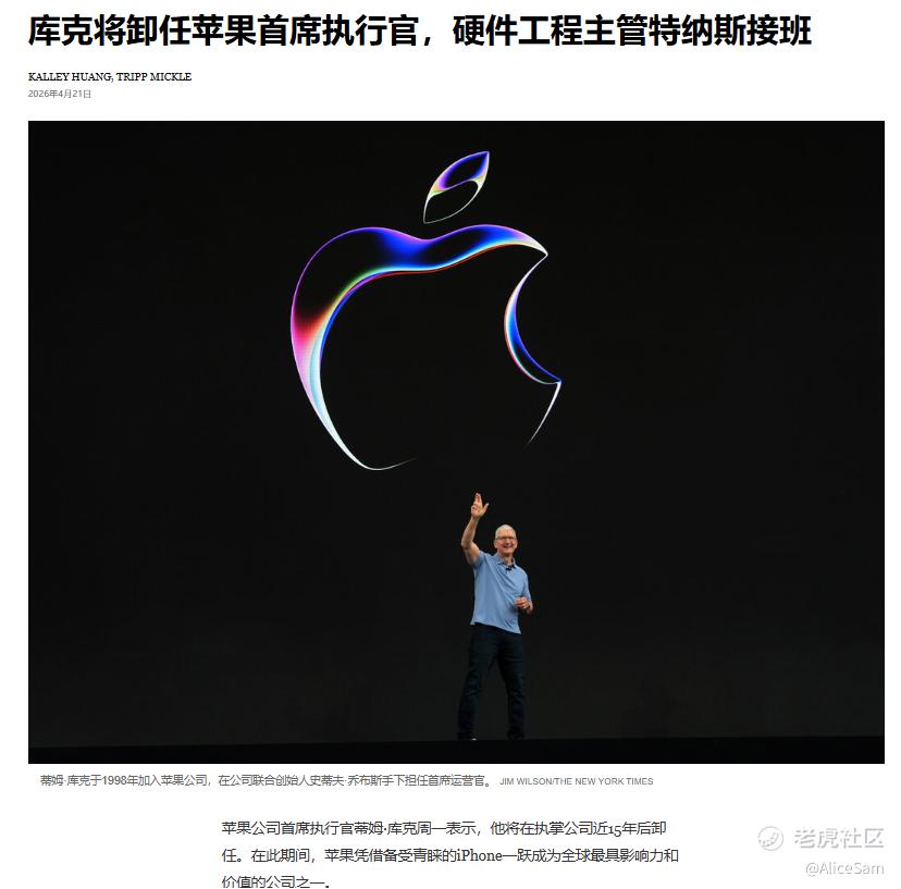 一个大新闻,哪里都在讨论。苹果要换帅了,看新闻说Tim Cook将于2026年9月1日卸任苹果CEO(转任Executive Chairman执行董事长),由硬件工程负责人约翰·特努斯John Ternus接任CEO位置,这是苹果自2011年乔布斯传位给库克以来的首次CEO更替。看大家更关注,好像不在谁接任,而在什么时候接任,这好像是市场真正在紧张的地方。