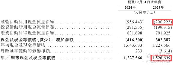 截至2025年12月31日,账上现金约人民币15.26亿元,经营现金流为-2.90亿元。