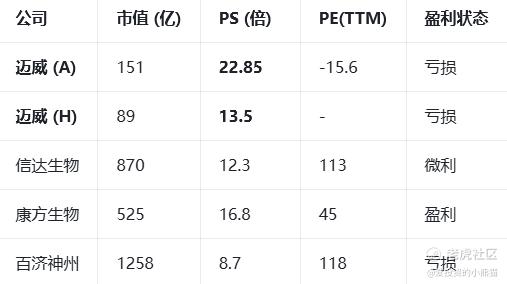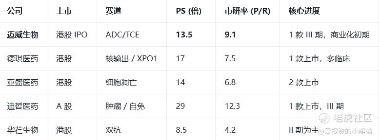 以本次港股发行中间价测算,对应整体市销率显著低于ADC赛道头部及同期上市的同类Biotech新股,相较A股自身估值也存在明显折价。 横向对比同行业可比公司来看,荣昌生物、科伦博泰、百力司康等核心ADC赛道企业,整体市销率估值远高于迈威生物,不管是已实现产品商业化的成熟标的,还是临床阶段的IPO新股,估值溢价都明显更高。