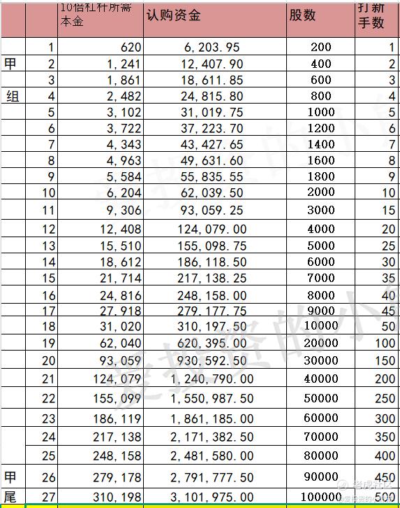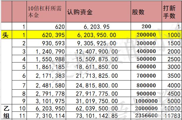这个票甲尾311万,乙头需要认购资金621万,乙组的各档融资所需要的本金还有融资金额对应如下表:
