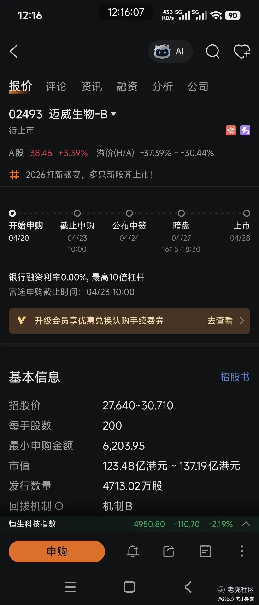 迈威生物这个票会怎么走。我觉得很取决于今天的华勤,今天华勤a股大涨4个点后,现在折价是35%,暗盘华勤如果走得很漂亮,那迈威这个票就有戏,如果华勤直接高开低走到甚至保发性,那这个票开盘也不会好到哪去,不过毕竟迈威生物是个A股,A股还是有价格锚定支撑,所以大跌倒也不至于,无非就是不赚钱而已,差的情况也就微幅破发。唯一的亮点就是没发绿鞋,港股通首日就可以来买,那么到底会有多少资金来做这些打新客的接盘侠?