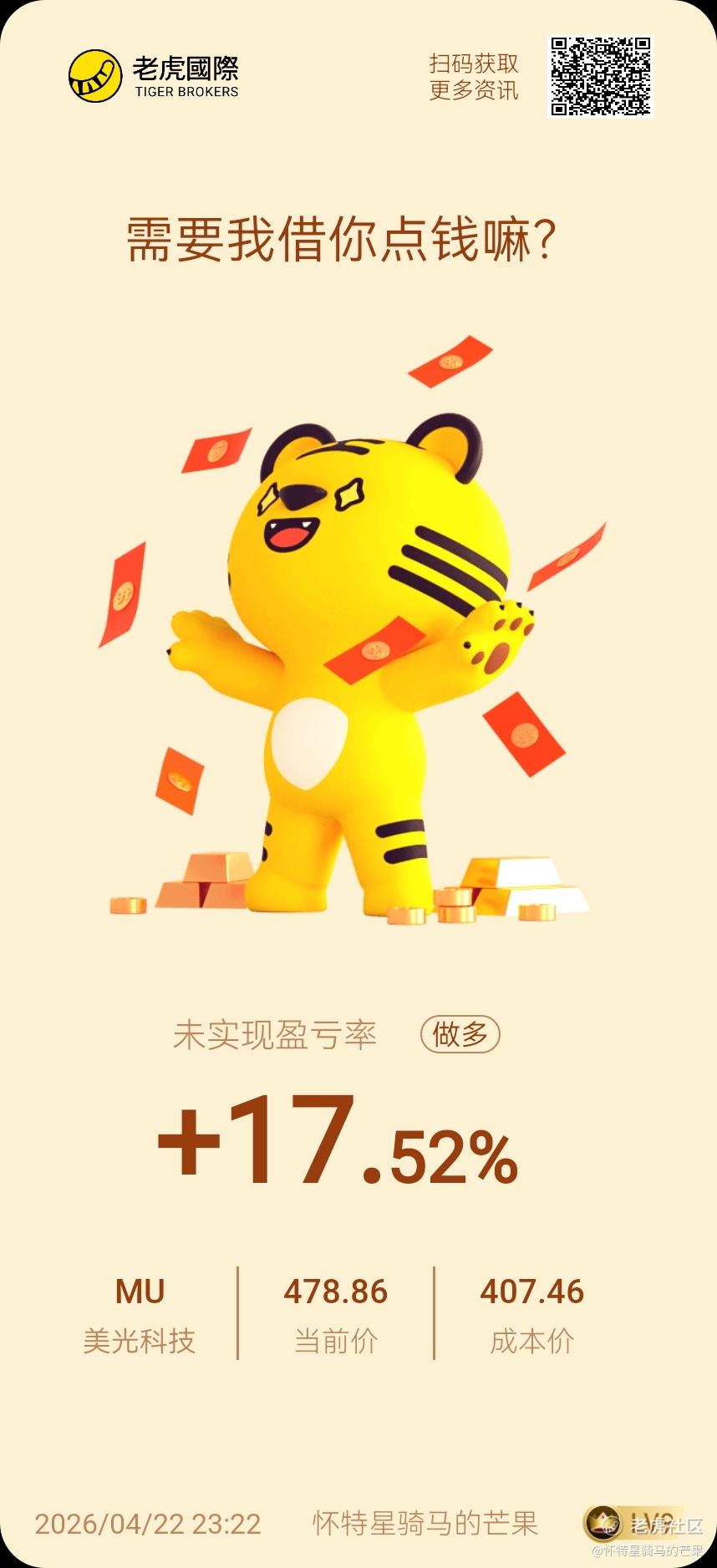 {"i18n":{"language":"zh_CN"},"data":{"magic":2,"id":556426893514536,"tweetId":"556426893514536","gmtCreate":1776874985283,"gmtModify":1776875476965,"author":{"id":3461311533630585,"idStr":"3461311533630585","authorId":3461311533630585,"authorIdStr":"3461311533630585","name":"怀特星骑马的芒果","avatar":"https://static.tigerbbs.com/023c0acad9bae7e29f381a1e88cfca49","vip":1,"userType":1,"introduction":"","boolIsFan":false,"boolIsHead":false,"hat":"https://static.tigerbbs.com/e1c01e958f63198f5d9648b59135f687","crmLevel":9,"crmLevelSwitch":0,"individualDisplayBadges":[],"wearingBadges":[],"fanSize":3,"starInvestorFlag":false},"themes":[{"themeId":"5bfad02ab61749c8bfe6573ac7bbe8a3","categoryId":"b76d3c59fc044df59779c041b25852a6","name":"晒晒更赚钱","type":0,"rnLink":"https://laohu8.com/RN?name=RNTheme&page=/theme/detail&rndata={\"themeId\":5bfad02ab61749c8bfe6573ac7bbe8a3}&rnconfig={\"headerBarHidden\": true}","description":"晒晒你的盈亏单,秀秀虎友们的实力!","image":"https://static.tigerbbs.com/347184265ee0be8c363259951f8033cb"}],"images":[{"img":"https://static.tigerbbs.com/9f43de210570b6ecc04675c659e5fbac","width":"858","height":"1877"}],"coverImages":[{"img":"https://static.tigerbbs.com/9f43de210570b6ecc04675c659e5fbac","width":"858","height":"1877"}],"title":"","html":"<html><head></head><body><p><a href=\"https://laohu8.com/S/MU\">$美光科技(MU)$ </a> </p><img src=\"https://static.tigerbbs.com/9f43de210570b6ecc04675c659e5fbac\" tg-width=\"858\" tg-height=\"1877\"></body></html>","htmlText":"<html><head></head><body><p><a href=\"https://laohu8.com/S/MU\">$美光科技(MU)$ </a> </p><img src=\"https://static.tigerbbs.com/9f43de210570b6ecc04675c659e5fbac\" tg-width=\"858\" tg-height=\"1877\"></body></html>","text":"$美光科技(MU)$","highlighted":1,"essential":1,"paper":1,"likeSize":1,"commentSize":0,"repostSize":0,"favoriteSize":0,"link":"https://laohu8.com/post/556426893514536","repostId":0,"isVote":1,"tweetType":1,"viewCount":415,"commentLimit":10,"likeStatus":false,"favoriteStatus":false,"reportStatus":false,"symbols":["MU"],"verified":2,"subType":0,"readableState":1,"langContent":"EN","currentLanguage":"EN","warmUpFlag":false,"orderFlag":false,"shareable":true,"causeOfNotShareable":"","featuresForAnalytics":["晒单贴"],"commentAndTweetFlag":false,"andRepostAutoSelectedFlag":false,"upFlag":false,"length":14,"optionInvolvedFlag":false,"xxTargetLangEnum":"ORIG"},"commentList":[],"hasMoreComment":false,"orderType":2}