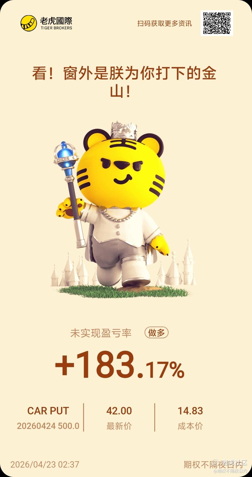 {"i18n":{"language":"zh_CN"},"data":{"magic":2,"id":556460205838624,"tweetId":"556460205838624","gmtCreate":1776883045522,"gmtModify":1776883048637,"author":{"id":3445990815937032,"idStr":"3445990815937032","authorId":3445990815937032,"authorIdStr":"3445990815937032","name":"期权不隔夜日内","avatar":"https://static.tigerbbs.com/aed3e8b8076a16e17f56654bce4b915a","vip":1,"userType":1,"introduction":"","boolIsFan":false,"boolIsHead":false,"crmLevel":6,"crmLevelSwitch":0,"individualDisplayBadges":[],"wearingBadges":[],"fanSize":198,"starInvestorFlag":false},"themes":[{"themeId":"5bfad02ab61749c8bfe6573ac7bbe8a3","categoryId":"b76d3c59fc044df59779c041b25852a6","name":"晒晒更赚钱","type":0,"rnLink":"https://laohu8.com/RN?name=RNTheme&page=/theme/detail&rndata={\"themeId\":5bfad02ab61749c8bfe6573ac7bbe8a3}&rnconfig={\"headerBarHidden\": true}","description":"晒晒你的盈亏单,秀秀虎友们的实力!","image":"https://static.tigerbbs.com/347184265ee0be8c363259951f8033cb"}],"images":[{"img":"https://static.tigerbbs.com/b6731ba02815db0db01862c860c80210","width":"882","height":"1668"}],"coverImages":[{"img":"https://static.tigerbbs.com/b6731ba02815db0db01862c860c80210","width":"882","height":"1668"}],"title":"","html":"<html><head></head><body><p><a href=\"https://laohu8.com/OPT/CAR 20260424 500.0 PUT\">$CAR 20260424 500.0 PUT$ </a> 加把劲 兄弟</p><img src=\"https://static.tigerbbs.com/b6731ba02815db0db01862c860c80210\" tg-width=\"882\" tg-height=\"1668\"></body></html>","htmlText":"<html><head></head><body><p><a href=\"https://laohu8.com/OPT/CAR 20260424 500.0 PUT\">$CAR 20260424 500.0 PUT$ </a> 加把劲 兄弟</p><img src=\"https://static.tigerbbs.com/b6731ba02815db0db01862c860c80210\" tg-width=\"882\" tg-height=\"1668\"></body></html>","text":"$CAR 20260424 500.0 PUT$ 加把劲 兄弟","highlighted":1,"essential":1,"paper":1,"likeSize":0,"commentSize":0,"repostSize":0,"favoriteSize":0,"link":"https://laohu8.com/post/556460205838624","repostId":0,"isVote":1,"tweetType":1,"viewCount":138,"commentLimit":10,"likeStatus":false,"favoriteStatus":false,"reportStatus":false,"symbols":["CAR","CAR 20260424 500.0 PUT"],"verified":2,"subType":0,"readableState":1,"langContent":"CN","currentLanguage":"CN","warmUpFlag":false,"orderFlag":false,"shareable":true,"causeOfNotShareable":"","featuresForAnalytics":["晒单贴"],"commentAndTweetFlag":false,"andRepostAutoSelectedFlag":false,"upFlag":false,"length":31,"optionInvolvedFlag":true,"xxTargetLangEnum":"ZH_CN"},"commentList":[],"hasMoreComment":false,"orderType":2}