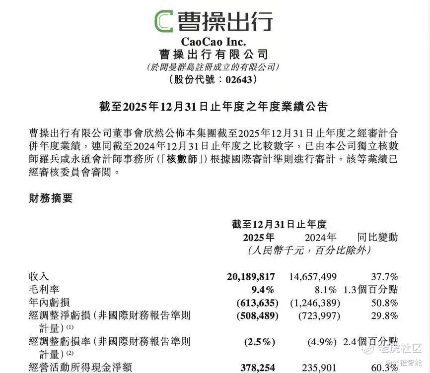 2025年,曹操出行全年实现收入202亿元人民币,同比增长38%。与此同时,毛利率从2024年同期的8.1%提升至9.4%,微增1.3个百分点。 而净亏损则同比大幅收窄50.8%;经营活动所得现金净额同比增长60.3%。
