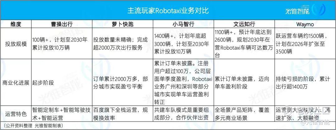 当前,Robotaxi行业已经步入了商业化验证期,头部玩家都在加速狂奔,投放规模不断扩大,赛道竞争日趋激烈。其中,小马智行Robotaxi车队规模截至2026年3月,已经超过了1400辆,预计年底前车队规模超3000辆;文远知行则在1100辆左右,预计今年役车队规模将超过2600台;萝卜快跑并未公布最新的精确的车队数量,但已累计完成超过2000万次出行。曹操出行在此领域则刚刚起步,虽具备运营、车源与成本优势,但仍面临技术追赶、市场内卷与资金投入的压力。