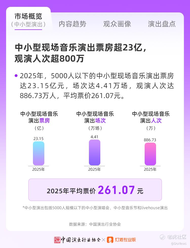 2025年,5000人以下的中小型现场音乐演出表现活跃,票房达23.15亿元,场次达4.41万场,观演人次达886.73万人,已成为现场音乐用户的重要选择。