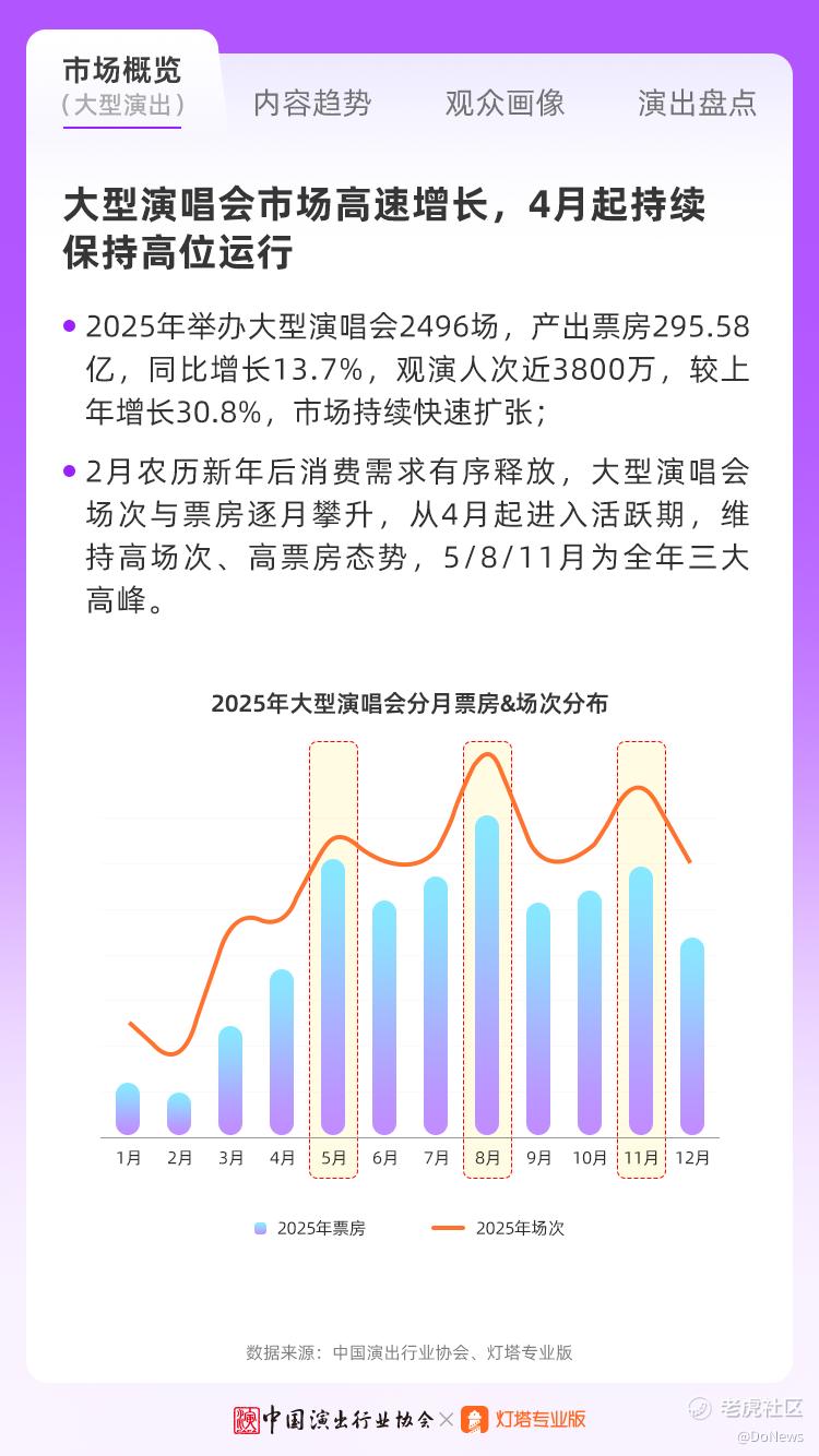 4月22日,在2026中国演出交易会现场音乐演出市场专题论坛上,中国演出行业协会与灯塔专业版共同发布了《格局升维,生态延展——2025现场音乐演出市场分析报告》(以下简称报告)。报告显示,2025年大型演唱会继续保持高增长态势,票房与观演人次双双创下新高。其中,大型演唱会票房达295.58亿,同比增长13.7%;观演人次近3800万,同比增长30.8%。