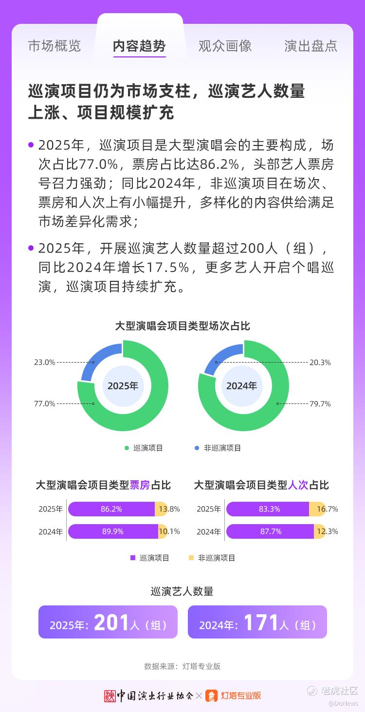 报告指出,2025年巡演项目仍是大型演唱会市场的核心支柱,头部艺人票房号召力持续强劲。全年共有201组艺人举办了巡回演唱会,同比增长17.5%。其中,巡演项目场次占比达77.0%,票房占比高达86.2%。