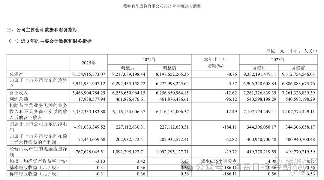 4月22日晚间,卤制食品连锁企业绝味食品股份有限公司(证券简称:ST绝味)披露2025年年度报告及2026年第一季度经营业绩。公告显示,公司2025年度实现营业收入54.67亿元,同比下降12.62%;归属于上市公司股东的净利润为-1.91亿元,较上年同期2.27亿元由盈转亏。据悉,这是绝味食品自2017年上市以来首次年度亏损。