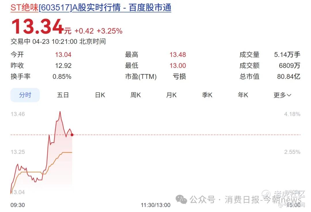 截至发稿,ST绝味股价报13.34元/股,涨超3%,市值约80.84亿元。