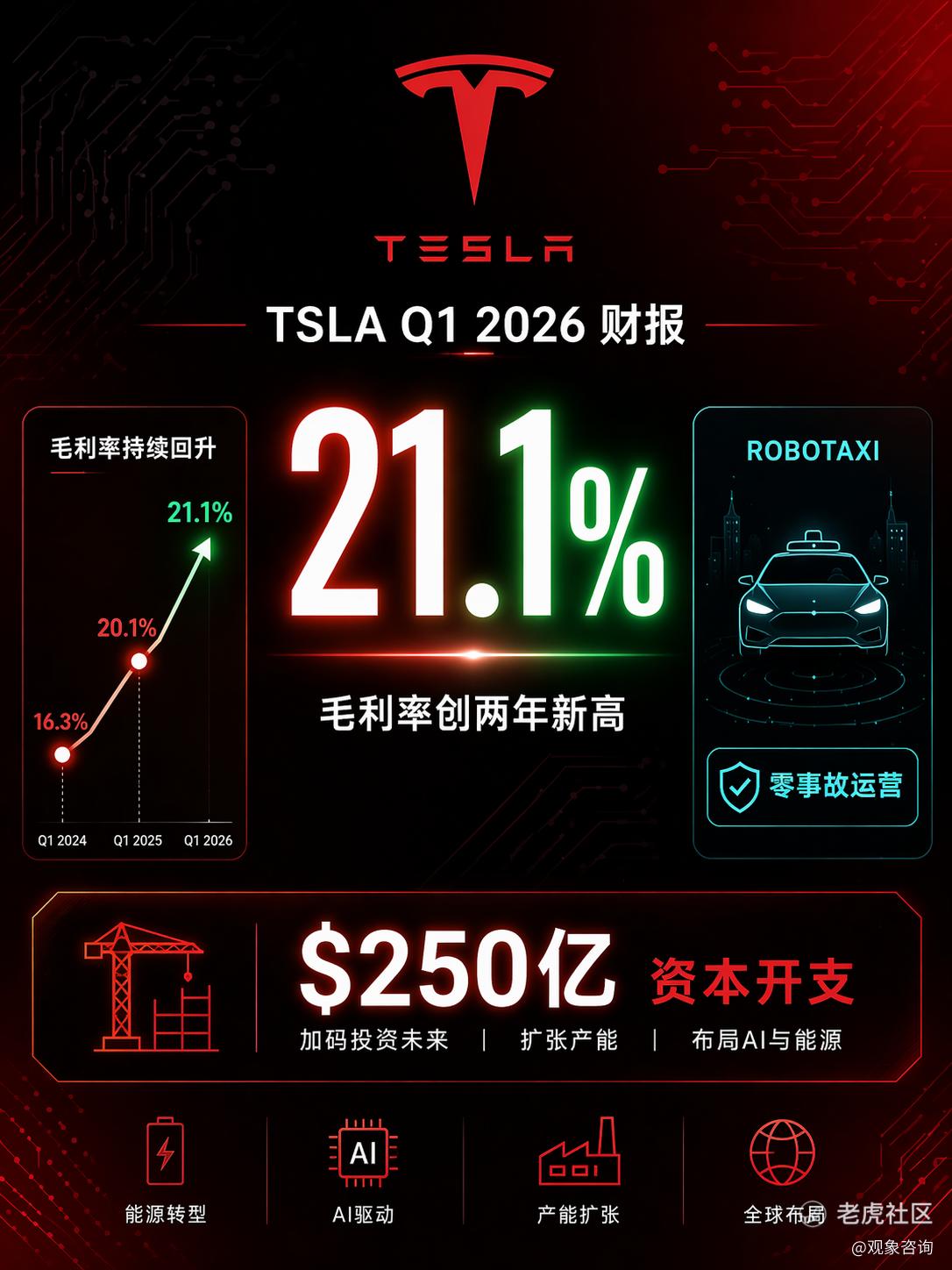 TSLA Q1 财报拆解:毛利率 21.1% 创两年新高,Robotaxi 零事故运营,但 250 亿 capex 引发分歧