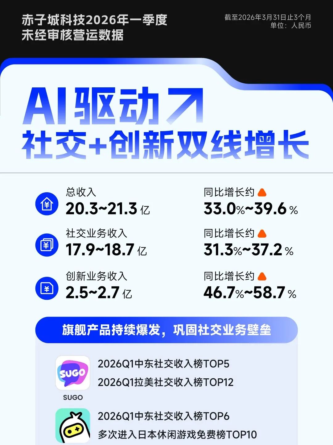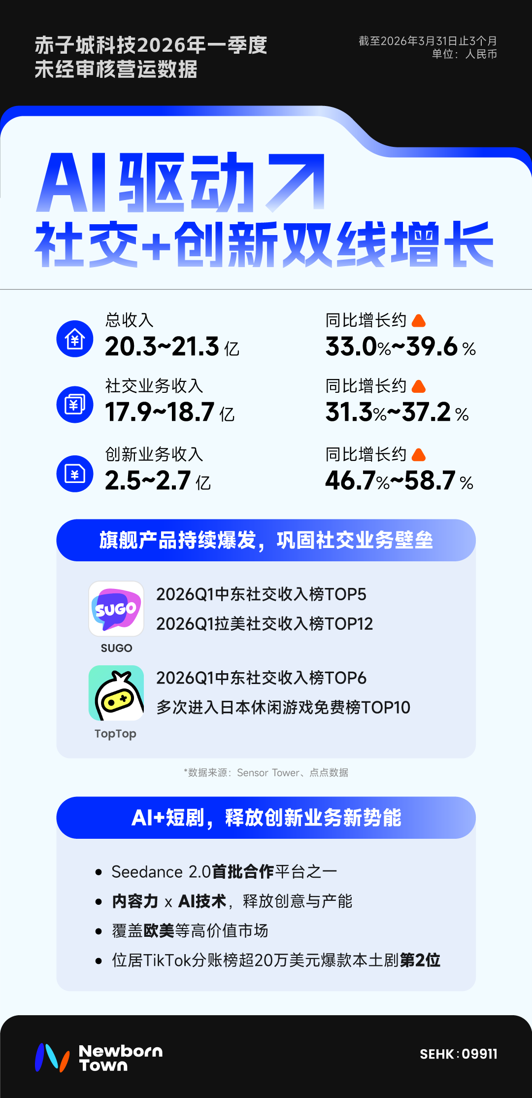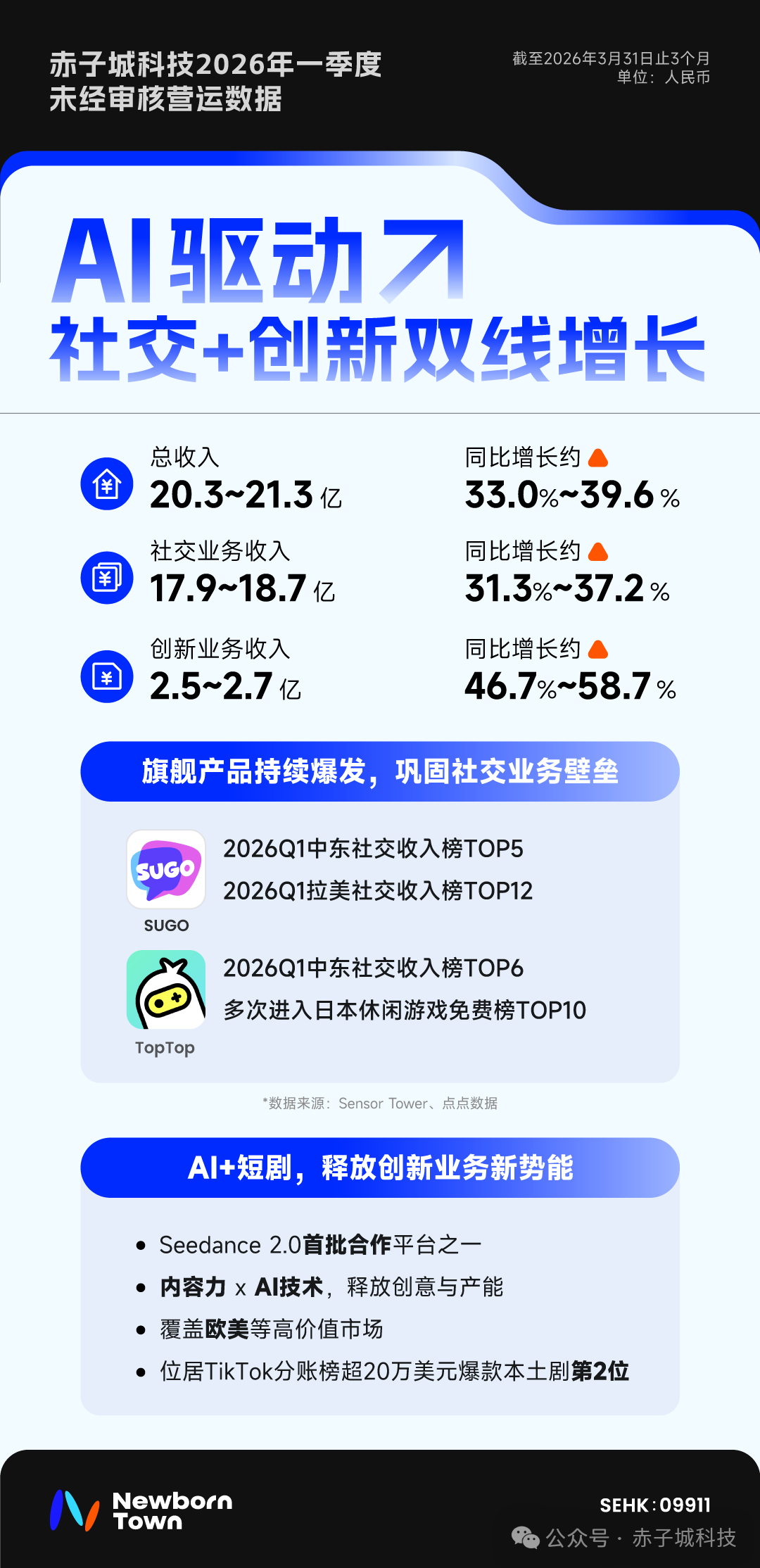 1️⃣ 社交业务:旗舰产品全球排名提升🔥 SUGO、TopTop长期在中东北非市场位列Sensor Tower社交网络收入榜前列;SUGO在拉美市场位列Sensor Tower中国非游戏应用海外收入榜Top 12;TopTop在日本市场多次登上点点数据App Store休闲游戏免费榜Top 10。2️⃣ 创新业务:AI 驱动高增,短剧有序推进🎬︎ 公司积极布局AI短剧,已正式接入Seedance 2.0,成为首批合作企业,并与TikTok联运,覆盖欧美等多个全球主要市场。3️⃣ 股东回报与市场认可📈 3月9日,公司正式纳入港股通,拓宽内地投资者参与渠道;公司计划未来两年斥资约3亿港元回购股份,并用于员工激励或予以注销。